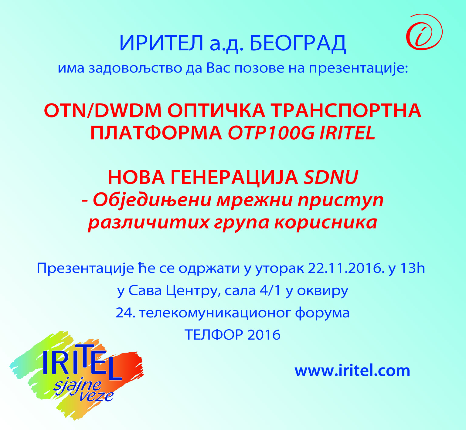 IRITEL a.d. BEOGRAD je učestvovao na 24. telekomunikacionom forumu TELFOR 2016 od 22 .do 23. novembra 2016. godine. u Sava Centru u Beogradu.