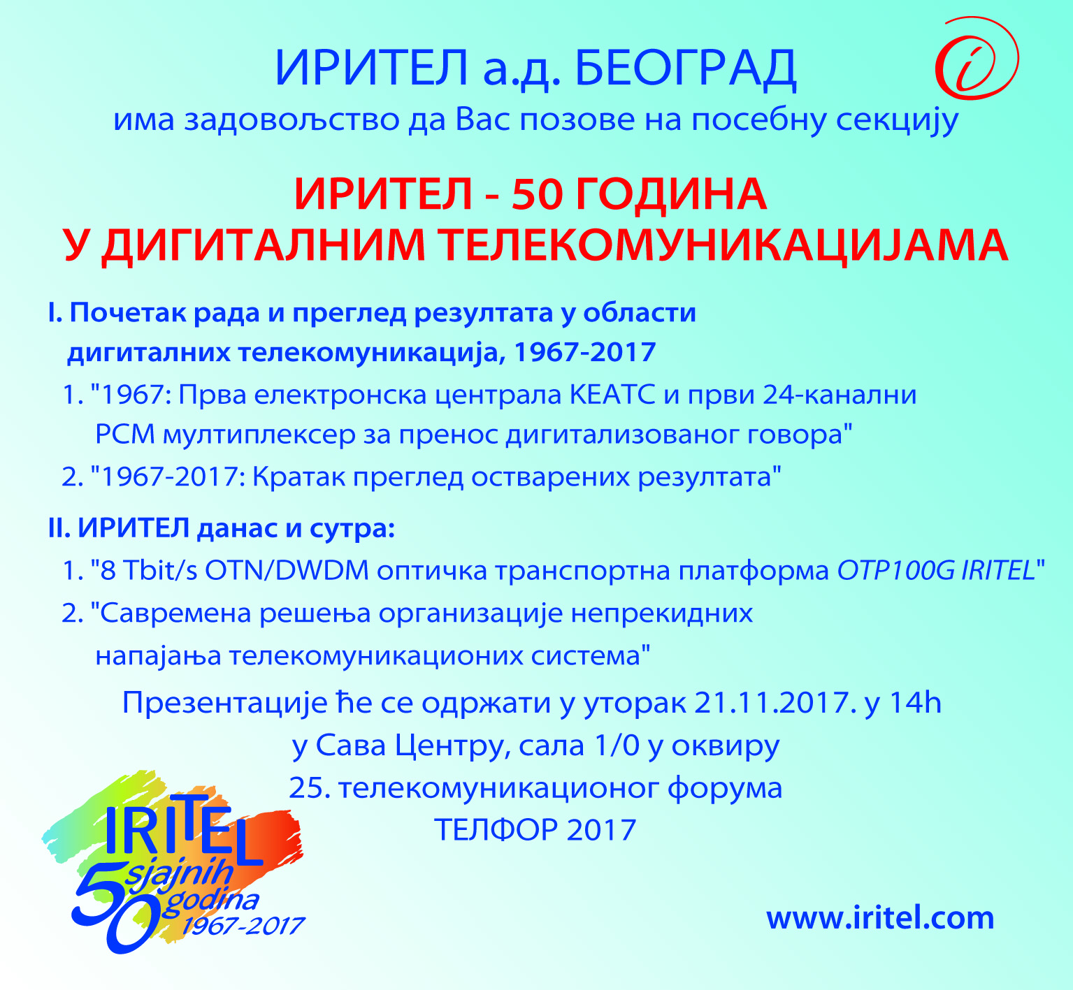 IRITEL a.d. BEOGRAD je učestvovao na 25. telekomunikacionom forumu TELFOR 2017 od 21 .do 22. novembra 2017. godine u Sava Centru u Beogradu.